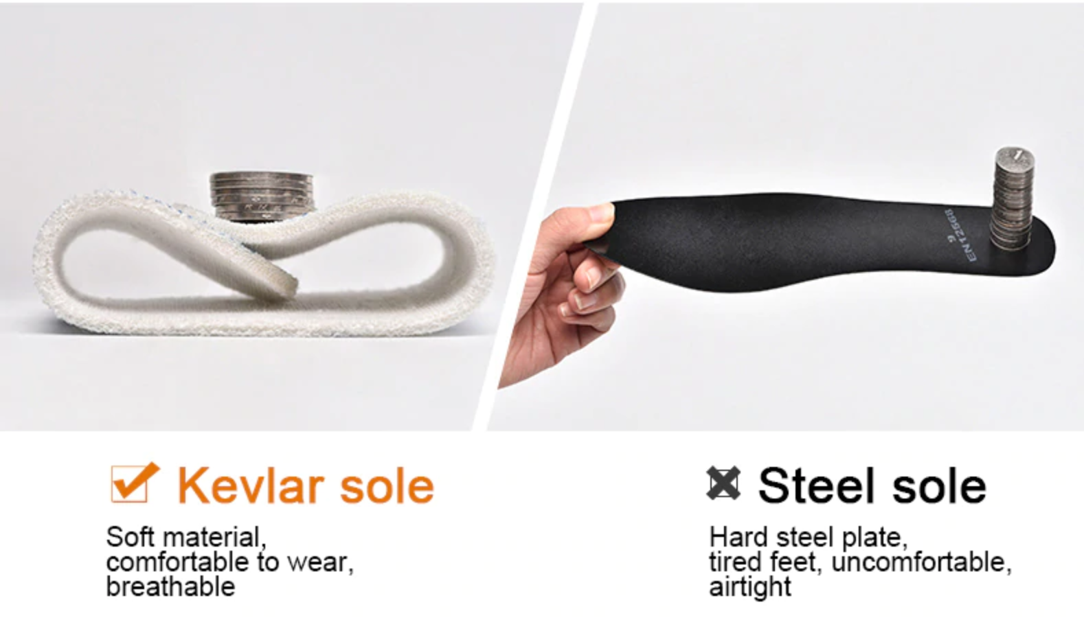 Best part of all, our composite toe work boots are extremely flexible and can flex almost a full 90° easily without breaking. In fact, these work safety boots can be run over with a car, hammered with a nail, or have heavy weight dropped on them without damaging your toes.